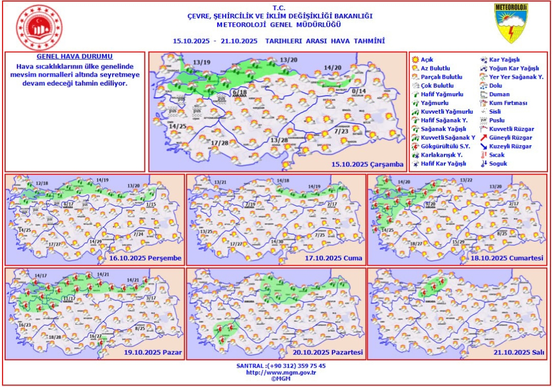 METEOROLOJİ VERİLERİNE GÖRE BÖLGELERİMİZDE HAVA DURUMU TAHMİNLERİ (15 EKİM ÇARŞAMBA)