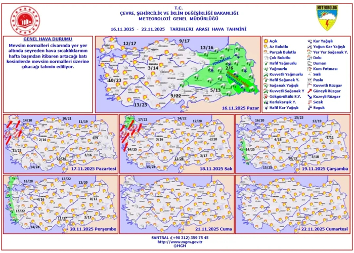 Yurdun kuzey, iç ve doğu kesimlerinin parçalı ve çok bulutlu, Doğu Karadeniz, Doğu Anadolu, Güneydoğu Anadolu'nun doğusu ile Kayseri ve Şanlıurfa çevrelerinin yağışlı, diğer yerlerin az bulutlu ve açık geçeceği tahmin ediliyor. Yağışların genellikle yağmur ve sağanak, Doğu Karadeniz'in iç kesimlerinin yüksekleri ile Doğu Anadolu'nun kuzey ve doğusunun yükseklerinde karla karışık yağmur ve yer yer kar şeklinde olması bekleniyor. Yağışların Bitlis, Muş, Siirt, Şırnak ve Hakkari çevreleri ile Van'ın güneybatı kesimlerinde yer yer kuvvetli olacağı tahmin ediliyor. Sabah ve gece saatlerinde Marmara, İç Ege, Batı Akdeniz'in iç kesimleri, İç Anadolu'nun kuzeybatısı ile Batı ve Orta Karadeniz'in iç kesimlerinde yer yer pus ve sis bekleniyor.