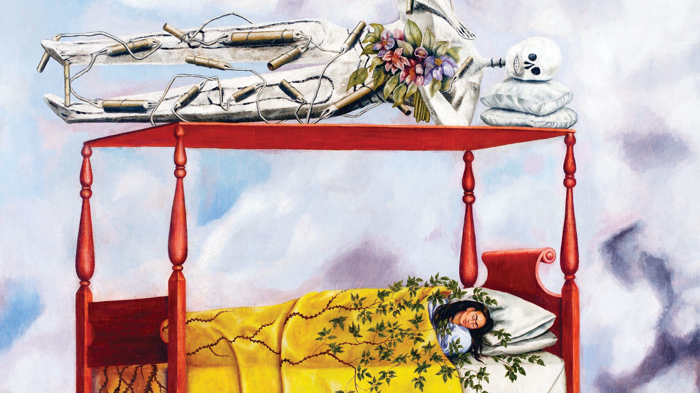 Otoportrede, Kahlo bulutların üzerinde süzülen bir yatakta uyurken tasvir ediliyor. Kahlo, altın bir battaniyeye sarılı, yeşil sarmaşıklar ve yapraklarla sarmalanırken yatağın üzerinde dinamitle sarılmış farklı çiçeklerle sarmalanan bir iskelet figürü yatıyor.