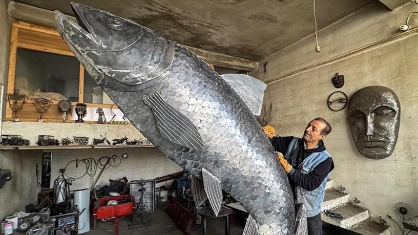 Van'da yaşayan İranlı heykeltıraş Mutii, 350 kilogramlık hurda demirden 3 metre 30 santimetrelik "inci kefali" heykeli yaptı.