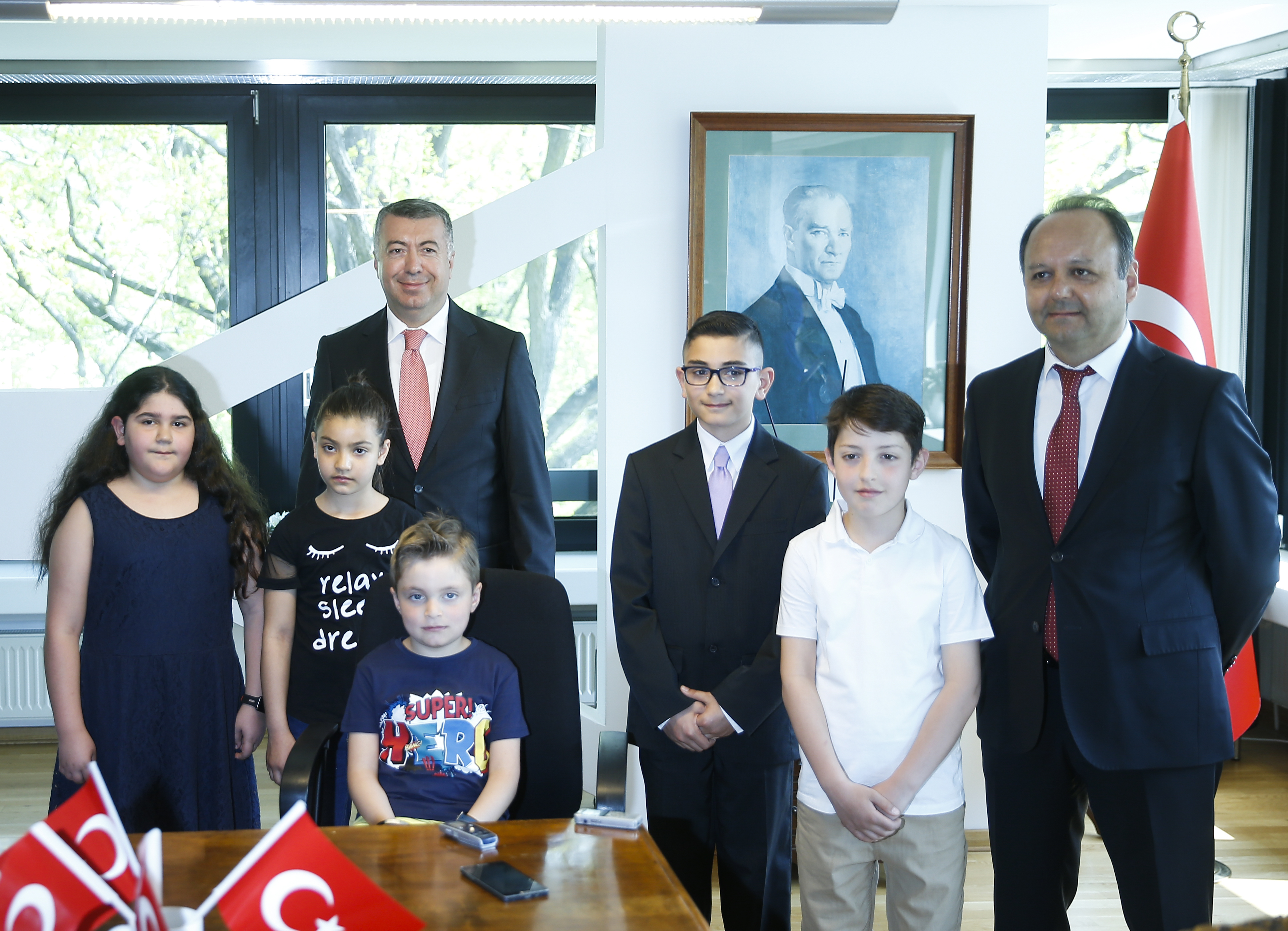 Türkiye'nin Berlin Başkonsolosu Mustafa Çelik, 23 Nisan Ulusal Egemenlik ve Çocuk Bayramı dolayısıyla Türk çocuklarını makamında kabul ederek sembolik olarak makam koltuğuna oturttu.