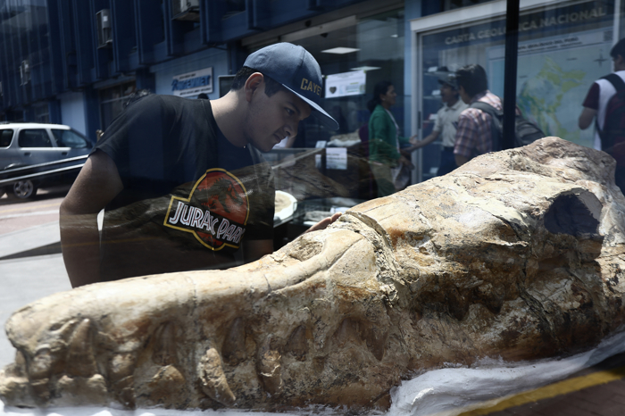 Peru'nun Lima kentinde bulunan 9 milyon yıllık olduğu belirtilen soyu tükenmiş geniş diş beyaz bir köpekbalığı fosili Jeoloji, Madencilik ve Metalurji Enstitüsü'nde sergilendi.