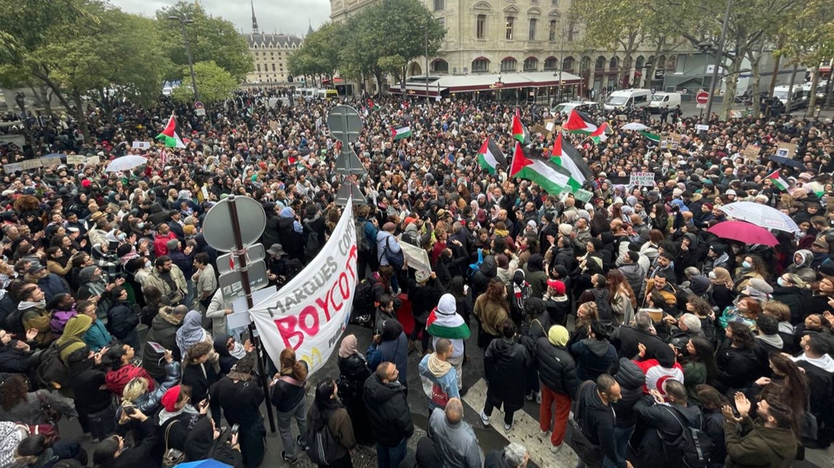 Fransa'nın başkenti Paris'te emniyet müdürlüğünün yasağına ve yağmura rağmen Filistin'e destek gösterisi düzenleniyor.