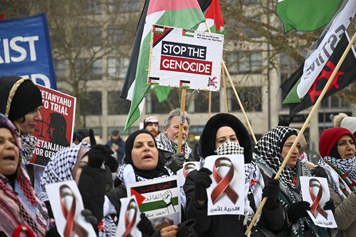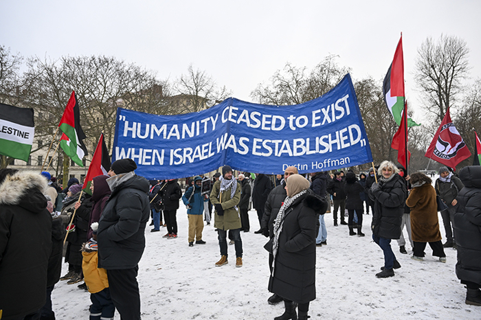 Göstericiler, "Siyonizm suçtur", "Filistin'e özgürlük" ve "Gazze zor durumda, orada binlerce çocuk üşüyor" şeklinde sloganlar attı.