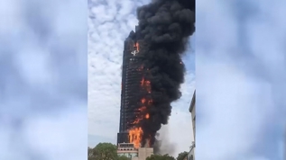 Çin medyasında yer alan habere göre, yerel saatle 17.00 civarında başlayan yangın, 218 metrelik gökdeleni tamamen sardı.