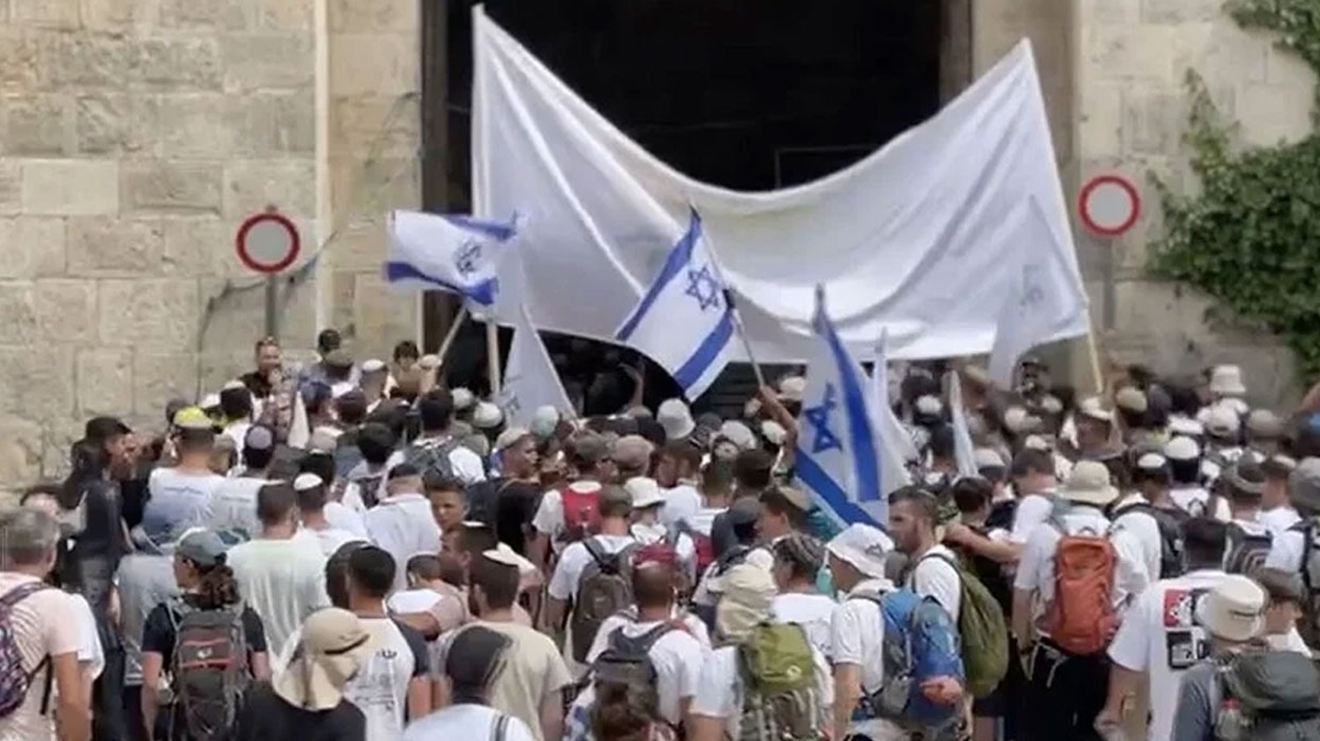 Binlerce kişilik fanatik yerleşimci grup, ellerinde İsrail bayrakları ve fanatik grupların flamalarıyla Eski Şehir'in sembolik Şam Kapısı bölgesine ulaştı.