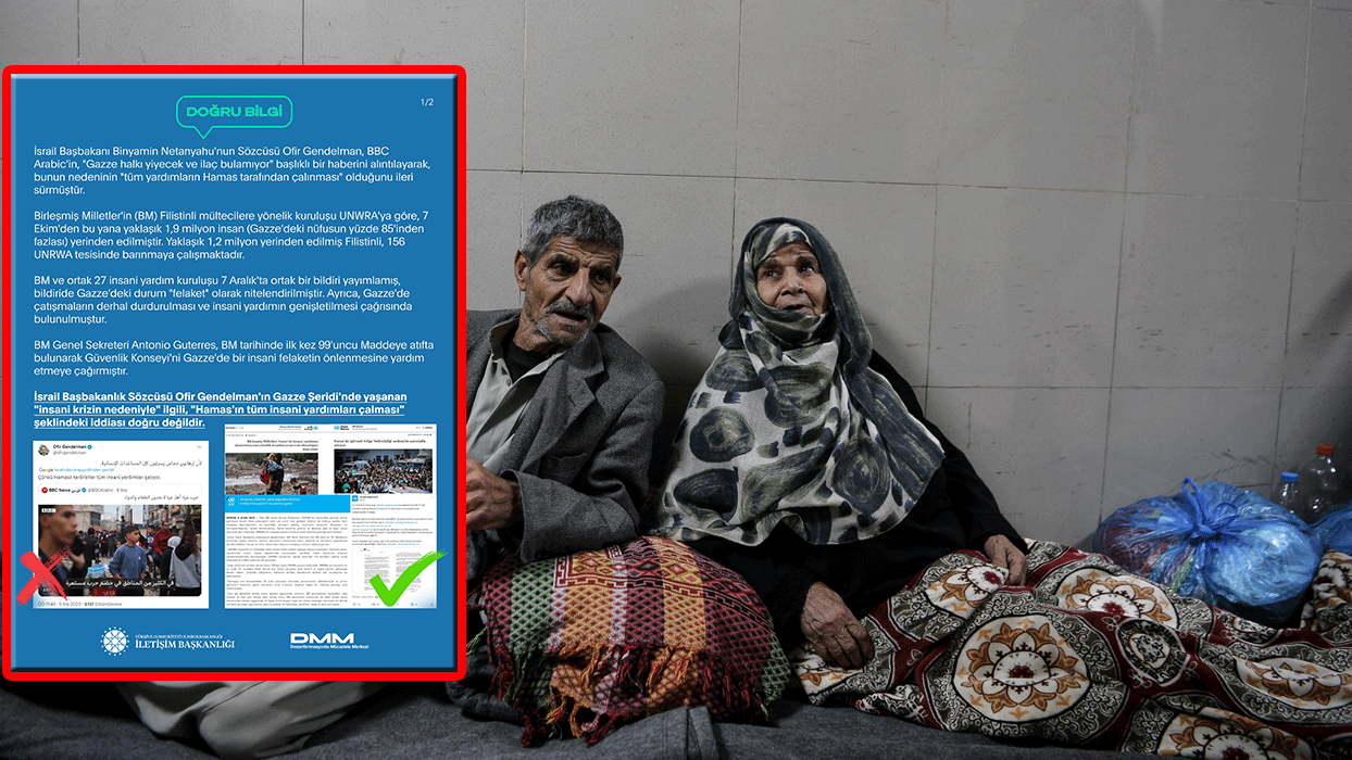 Dezenformasyonla Mücadele Merkezi, İsrail Başbakanlık Sözcüsü Ofir Gendelman'ın Gazze Şeridi'nde yaşanan "insani krizin nedeniyle" ilgili, "Hamas'ın tüm insani yardımları çalması" şeklindeki iddiasının doğru olmadığını açıkladı.
