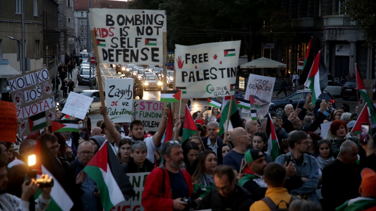 Hırvatistan'ın başkenti Zagreb'de Filistin'e destek yürüyüşü gerçekleştirildi. Göstericilerin Filistin bayrakları açtığı yürüyüşte "Zagreb Filistin'in yanında", "Hırvatistan Filistin'in yanında" ve "Daha kaç hayat?" yazılı dövizler taşındı.
