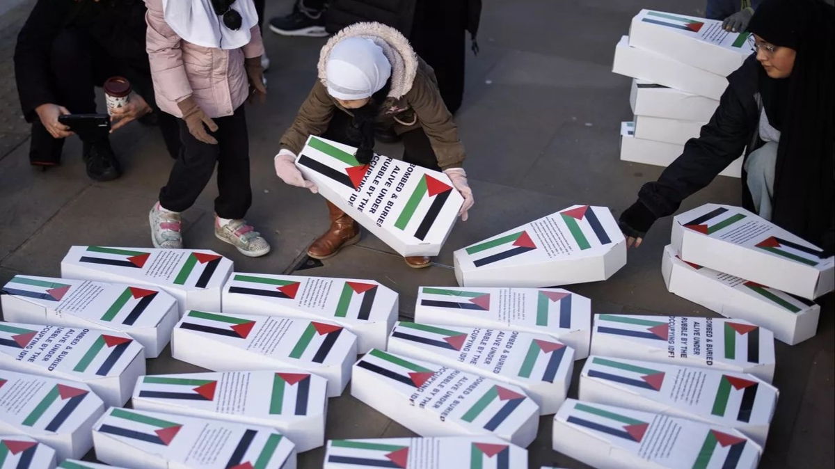 İngiltere'nin başkenti Londra'da Başbakanlık Konutu'nun yakınına İsrail saldırılarında Gazze Şeridi'nde hayatını kaybeden çocukların anısına 450'den fazla sembolik çocuk tabutu bırakıldı.