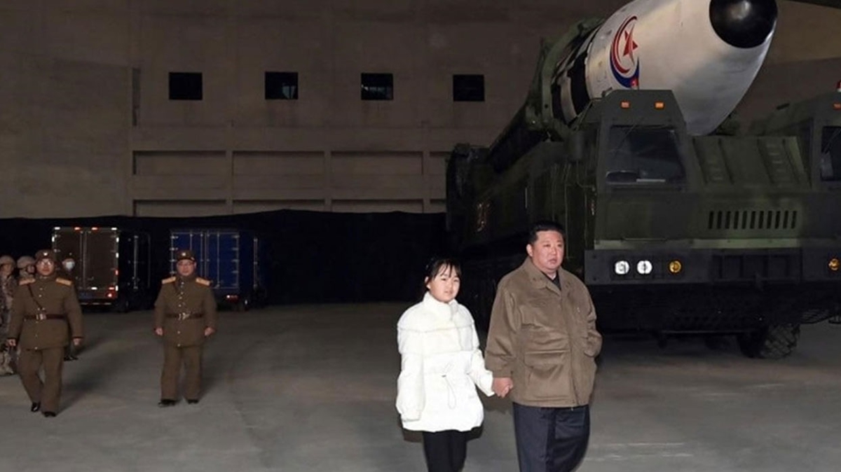 "Hwasong-17" füzesinin fırlatışını gösteren fotoğraflarda Kim'in, elinden tuttuğu 12-13 yaşlarındaki beyaz montlu bir kız çocuğu ile tekerlekli füze platformunun önünde yürüdüğü, piste taşınırken izlediği, dikey konuma getirildikten sonra pistte dolaştığı görülüyor.