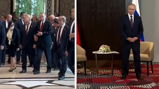 Putin, görüşmenin yapılacağı salonda Erdoğan'ı 1 dakika boyunca ayakta beklemesi dikkat çekdi.