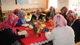 Bilecik'in Osmaneli ilçesine bağlı Çerkeşli Köyü İlkokulu ve Köy Yaşam Merkezi'nde "Okul Aile El ele, 7'den 70'e Okuyoruz ve Öğreniyoruz" projesi çerçevesinde kadınlar hem okuyorlar, hem de eğleniyorlar.