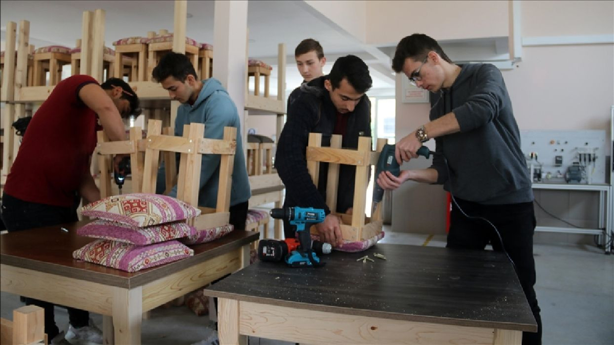 Muğla'nın Fethiye ilçesinde, Fethiye Esnaf ve Sanatkarlar Odası Mesleki Eğitim Merkezi öğrencileri, depremzedeler için portatif masa ve tabure üretimi yapıyor.