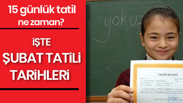 15 günlük karne tatiline bugün itibari ile 9 gün kaldı. Şubat tatili olarak bilinen 15 günlük karne tatili bu sene 20 Ocak ile 31 Ocak tarihleri arasında olacak. Öğrenciler ilk dönem karnesini 17 Ocak Cuma günü karneyi alacak. Böylece 18-19 Ocak günleri olan hafta sonları da 15 günlük tatillerine dahil olacak. On beş günlük tatil 2 Şubat akşamı bitecek ve öğrenciler 3 Şubat Pazartesi günü ikinci döneme başlayacak.