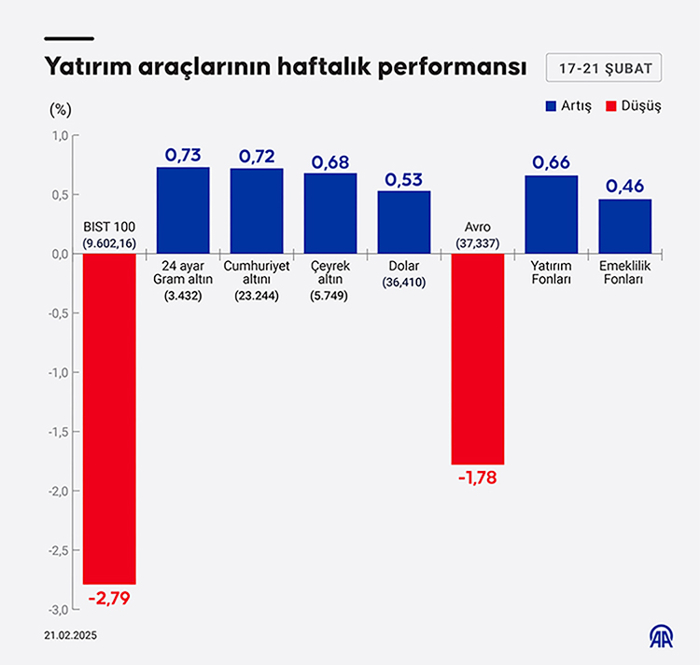 17 - 21 Şubat 2025 yatırım araçlarının performansı belli oldu. Borsa İstanbul'da işlem gören hisse senetleri haftalık bazda ortalama yüzde 2,79 değer kaybederken, avro/TL yüzde 1,78 geriledi, altının gram fiyatı yüzde 0,73, dolar/TL yüzde 0,53 artış kaydetti.