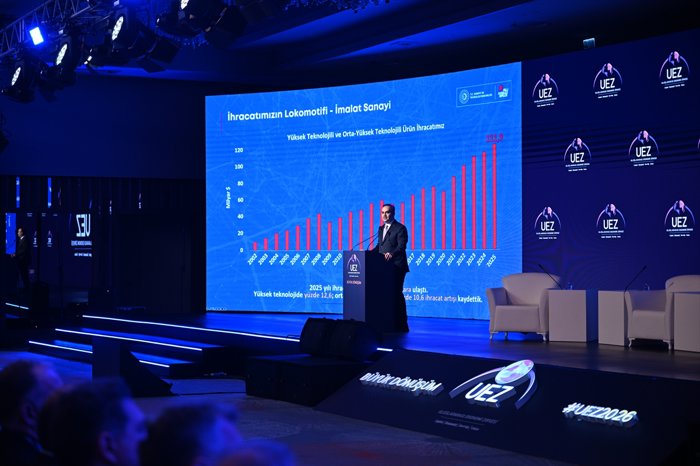 "2025 yılı ihracatımıza baktığımızda, yüksek teknolojili ürünlerde yüzde 12,5, orta-yüksek teknolojili ürünlerde yüzde 10,6 artış yakaladığımızı görüyoruz. Son 5 yıla baktığımızda, Türkiye'nin ihracattaki artışının tamamının yüksek ve orta-yüksek teknolojili ürünlerden geldiğini de ifade edebiliriz. Türkiye'nin ürün portföyü çok genişledi, rekabetçi olarak ihraç ettiğimiz ürün sayısı çok arttı ama bunun da ötesinde sahip olduğumuz coğrafi konumu, doğru lojistik yatırımları, bağlantısallık adımları sayesinde etkin şekilde değerlendirmeyi başardık ve rekabetçi olarak ihracat yaptığımız ülke sayısını 30 yıl öncesinin 2 mislinden daha ileri seviyeye taşıdık. Türkiye, Çin'den sonra Avrupa ortasına kadar uzanan geniş coğrafi kuşağın rekabet gücü en hızlı yükselen ihracatçı ülkesi oldu."