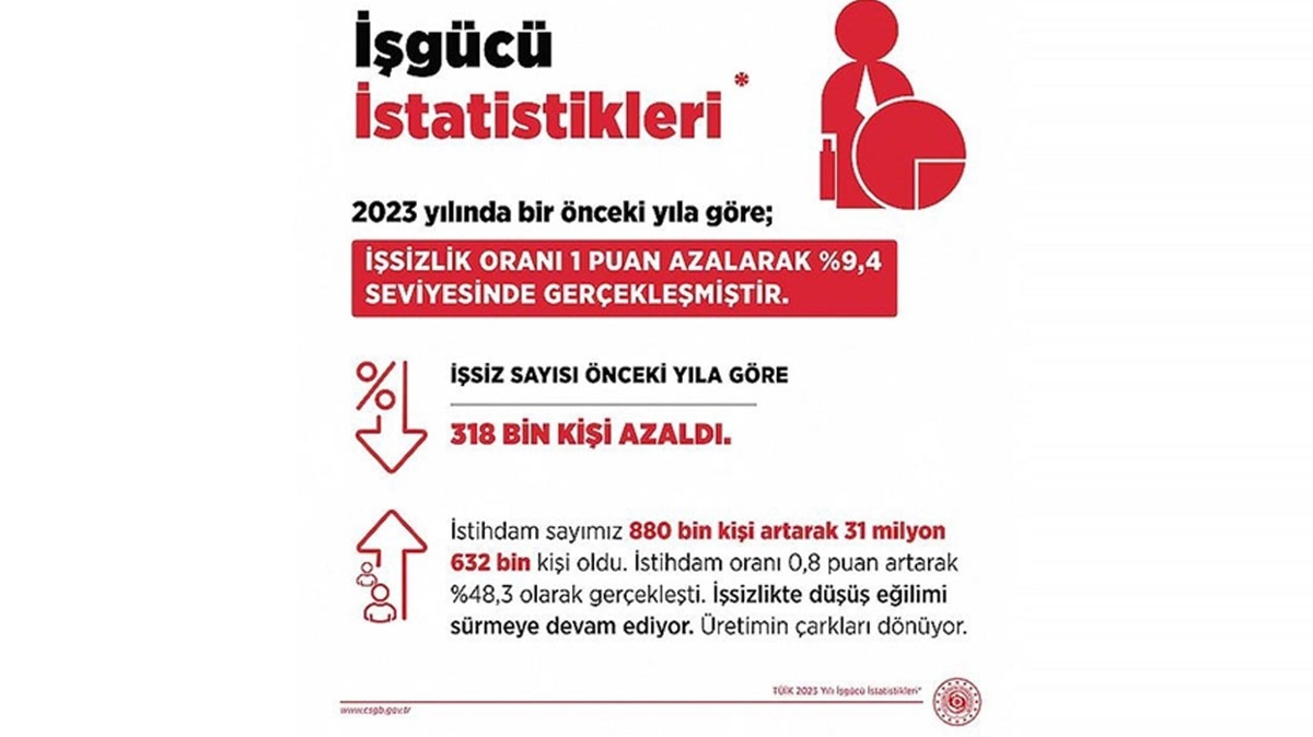 "İşsizlik oranı, 2023 yılında bir önceki yıla göre 1 puan azalış göstererek yüzde 9,4'e geriledi. Böylelikle Orta Vadeli Program'da öngördüğümüz yüzde 10,1'in altında ve son 10 yılın en düşük işsizlik seviyesini görmüş olduk. İstihdam sayımız ise aynı dönemde 880 bin kişi artarak, 31 milyon 632 bine yükseldi. Önümüzdeki dönemlerde de işsizlikle mücadeledeki kararlılığımızı ve istihdamı destekleyici politikalarımızı sürdürmeye devam edeceğiz."