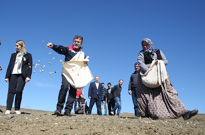Ardından sarımsak dikim önlüğü giyen Bakan Yumaklı, önlüğüne koyduğu sarımsakları ekti.