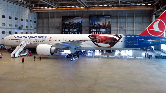 Türk Hava Yolları, “Batman v Superman: Adaletin Şafağı” filmi için Warner Bros Pictures ile gittiği işbirliği kapsamında Boeing 777-300ER tipi bir uçağını filmin temasına uygun olarak giydirdi. Batman ve Superman logolu uçak Türkiye ile ABD arasında sefer yapacak