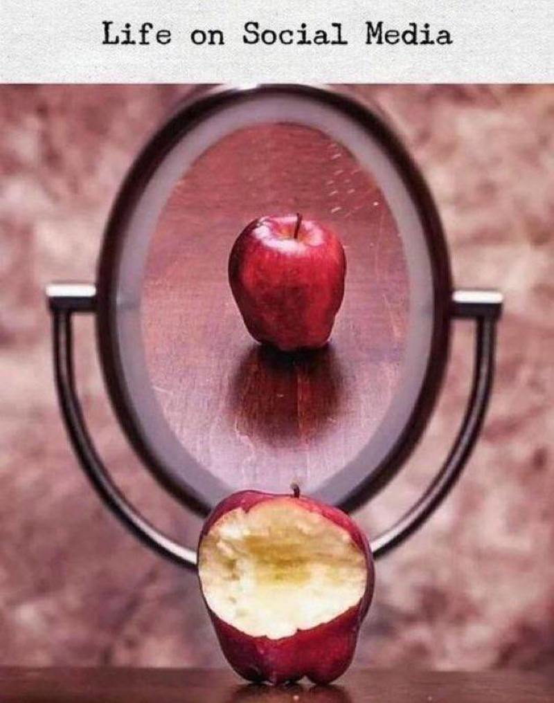Sosyal medyada paylaşılan görüntüler genellikle gerçek hayattan daha farklıdır. Bu görsel, dışarıya yansıttığımız mükemmel görüntülerin ardında yatan gerçekleri sorgulatıyor.