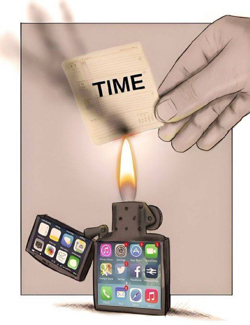 Bir çakmakla yakılan zaman kağıdı, sosyal medyanın zamanımızı nasıl tükettiğini gösteriyor. Çakmağın üzerindeki uygulama ikonları, sosyal medya platformlarının günlük yaşamımızdaki yeri ve zamanımızı nasıl harcadığımızı simgeliyor.