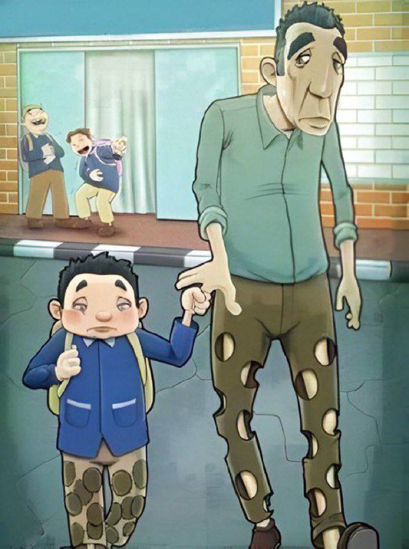 Bir baba ve oğulun çizildiği bu resimde, çocuğun pantolonu sağlam ve temizken, babanın pantolonu yıpranmış ve deliklerle dolu. Bu, ebeveynlerin fedakarlıklarını ve çocukları için gösterdikleri çabayı yansıtan dokunaklı bir sahne.