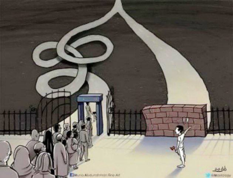 Güvenlik kapısından geçerek dolambaçlı yollara sapılan bir kalabalığın aksine, açık ve düz bir yoldan ilerleyen bir kişiyi gösteren bu karikatür, hayatın kolay ve zor yollarını, bireysel kararların önemini ve kendi yolunu çizmenin değerini simgeler.