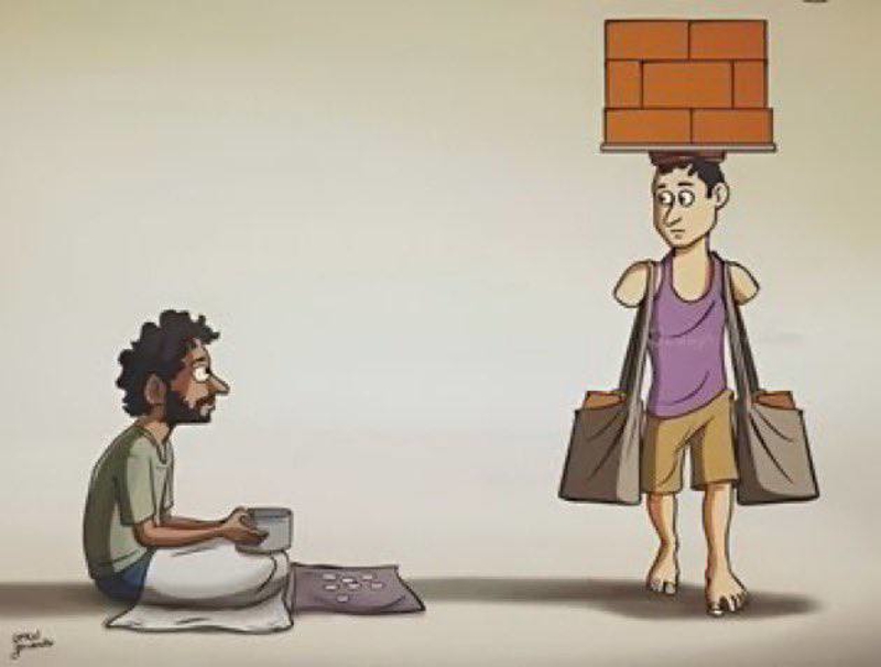 Bir yanda dilenci, diğer yanda elinde ağır yükler taşıyan bir adam. Bu görsel, farklı yaşam koşullarındaki zorlukları ve bireylerin karşılaştıkları güçlükleri algılama biçimlerini ele alıyor. Herkesin hayatında zorluklar var, ancak bu zorluklar farklı biçimlerde karşımıza çıkabilir ve senin bu zorluklarla nasıl başa çıktığın karakterini belirler. Pes etmeyi mi tercih edersin gayreti mi?