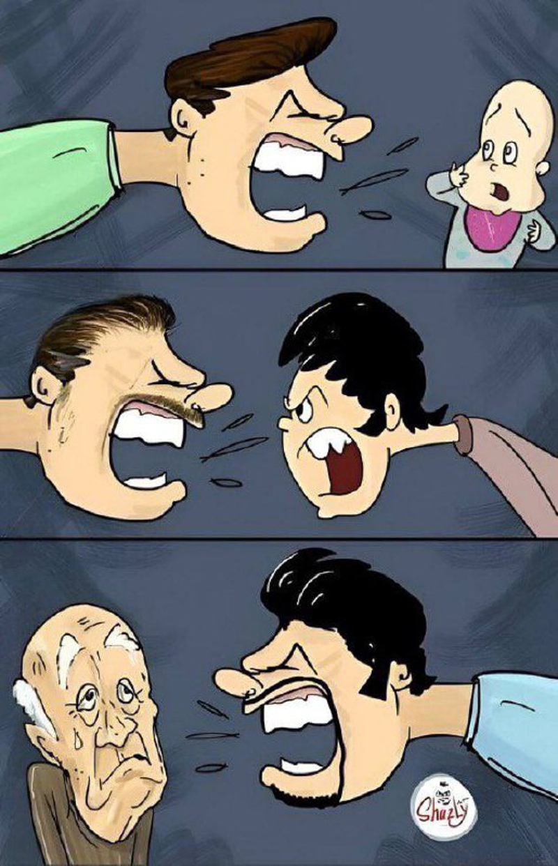 Bu görsel, üç kuşak boyunca devam eden öfkeyi ve bağırmayı gösteriyor. Öfkenin çocuklara nasıl miras kaldığını ve bu döngünün nesiller boyu nasıl sürdüğünü ele alıyor. Aile içindeki öfke kontrolünün önemini vurguluyor.