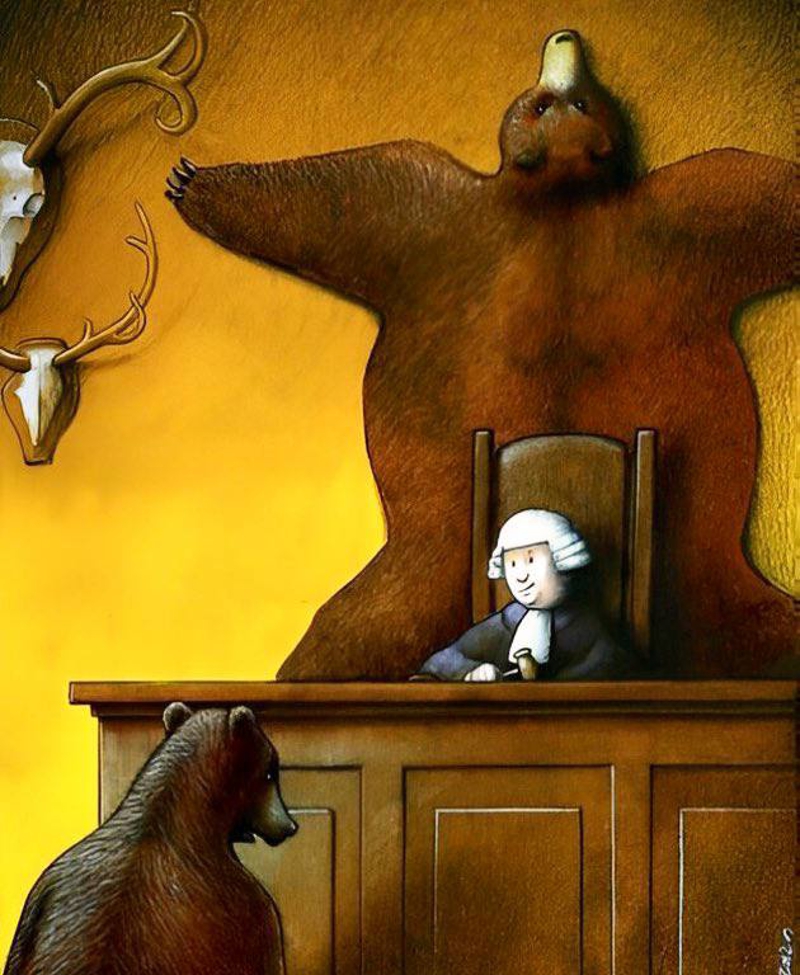 Bir mahkemede yargılanan ayı ve yargıç koltuğunda oturan bir insan figürü. Duvara asılı av trofe başları, av ve avcı arasındaki adaletsiz ilişkiyi ve doğa ile insan arasındaki çatışmayı simgeliyor. Adaletin, güçlü olanın lehine işlediğini eleştiren bir görsel.