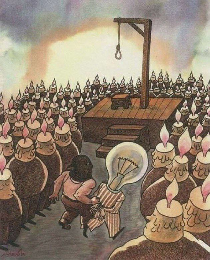 Bu görselde, bir grup mumun, bir ışık ampulünün idamını izlediği ve teşvik ettiği görülüyor. Ampul, yenilikleri ve fikirleri temsil ederken, mumlar geleneksel ve eski düşünceleri simgeliyor. Yeniliklere karşı direnç gösteren toplumların eleştirisini yansıtıyor.