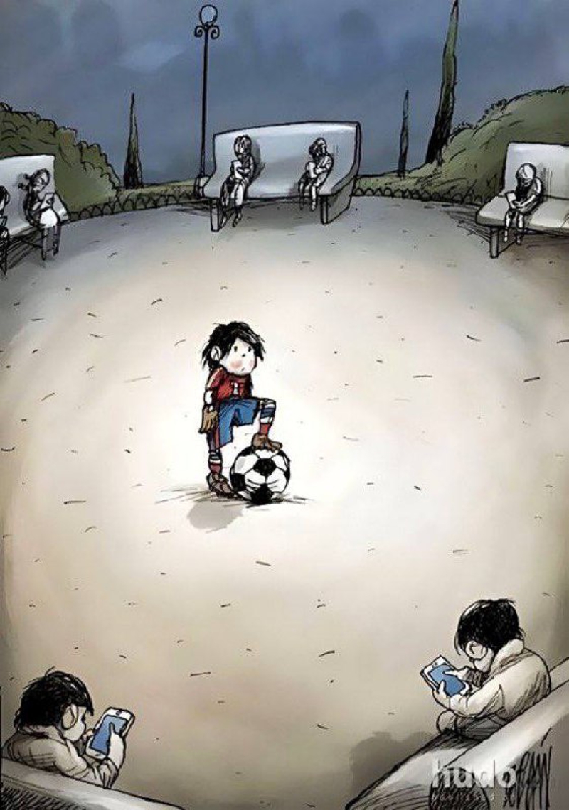 Bir parkta futbol oynamaya çalışan bir çocuğun etrafında telefonlarıyla meşgul olan diğer çocukları gösteren bu karikatür, teknolojinin çocukların sosyal hayatını nasıl etkilediğini ve dijital cihazlara bağımlılığın sosyal izolasyona yol açtığını eleştirir.