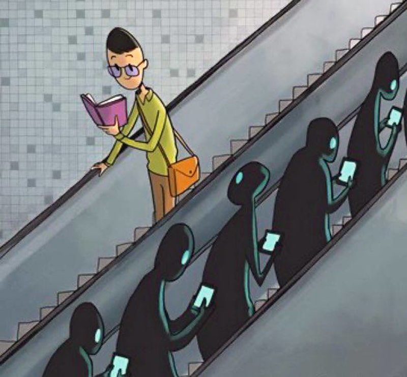 Bir yürüyen merdivende herkes telefonlarıyla meşgulken, bir kişinin kitap okuduğu bu görsel, dijital çağda bireyselliği ve özgünlüğü korumanın önemini vurguluyor. Toplumun dijitalleşmesine karşı bir direniş sembolü olarak kitap okuyan adam, farklılığı ve geleneksel bilgeliği temsil ediyor.