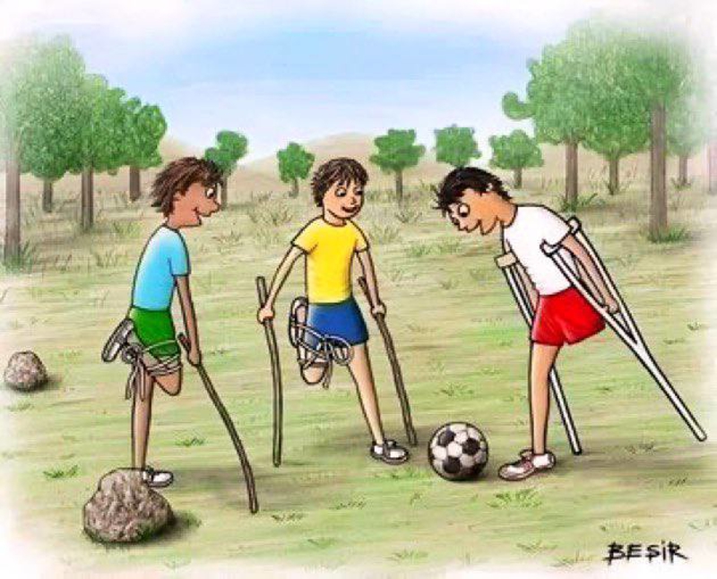 Fiziksel engellerine rağmen futbol oynayan çocukların gösterildiği bu karikatür, engellerin çocukların oyun ve neşe isteğini durduramayacağını ve her durumda mutlu olmanın yollarını bulabileceklerini vurgular.