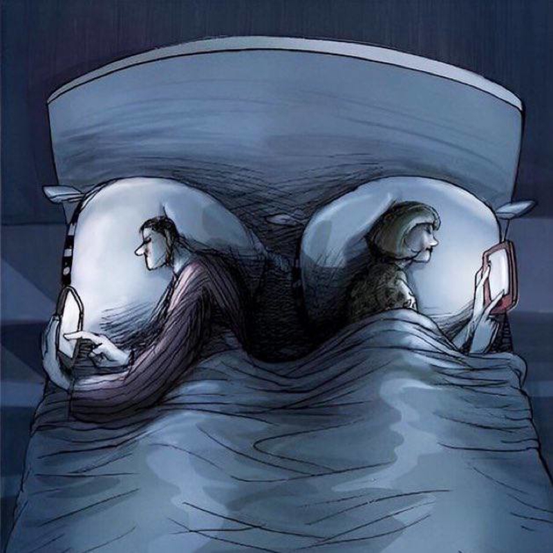 Bu görsel, aynı yatakta yatan bir çiftin birbirlerine sırtlarını dönerek telefonlarıyla meşgul olduklarını gösteriyor. Teknolojinin, çiftlerin fiziksel olarak bir arada olmalarına rağmen duygusal ve sosyal olarak birbirlerinden uzaklaşmalarına neden olduğunu ele alıyor.
