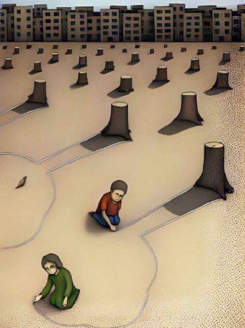 Kesilmiş ağaçların yerine çocukların yerde ağaç çizdiği bu karikatür, kentleşmenin ve doğal alanların yok oluşunun çocuklar üzerindeki etkisini ve kaybolan doğayı hatırlama çabasını anlatır.