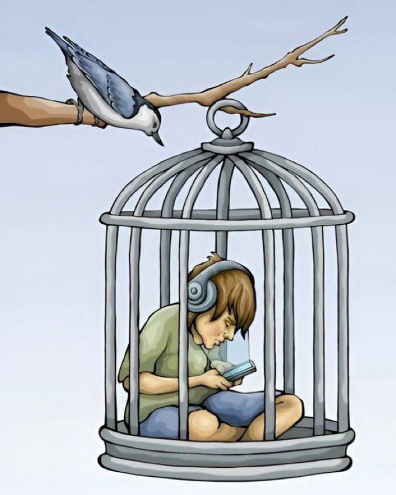 Bu görsel, dijital cihazlara bağımlılığın insanlar üzerindeki izole edici etkisini ele alıyor. Kafesteki bir çocuğun telefon ve kulaklıkla meşgul olması, modern dünyada dijital teknolojilerin insanları nasıl sosyal olarak izole ettiğini simgeliyor.