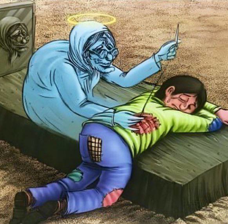 Bir hastane odasında doktorların bir hastayı hayatta tutma çabalarını gösteren bu karikatür, tıbbın ve insan direncinin ölümle olan mücadelesini ve tıbbi müdahalelerin önemini vurgular.