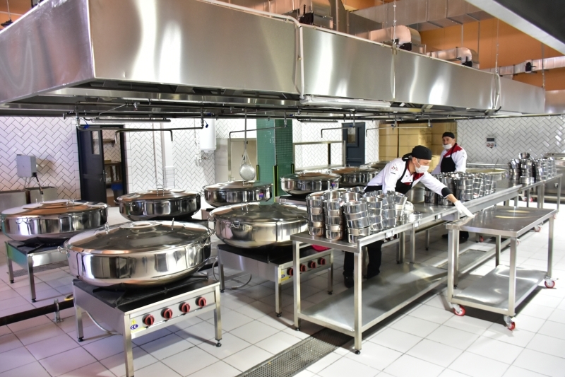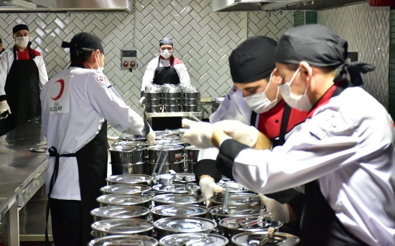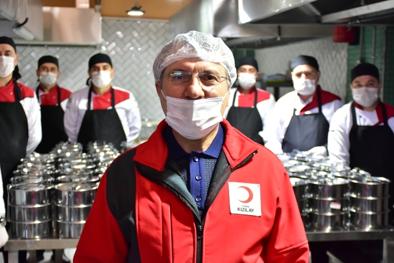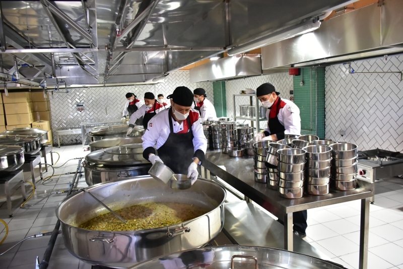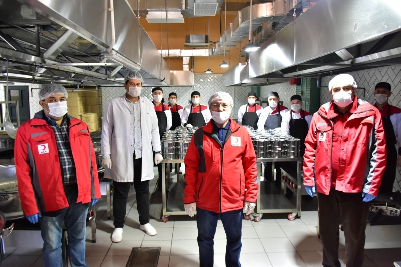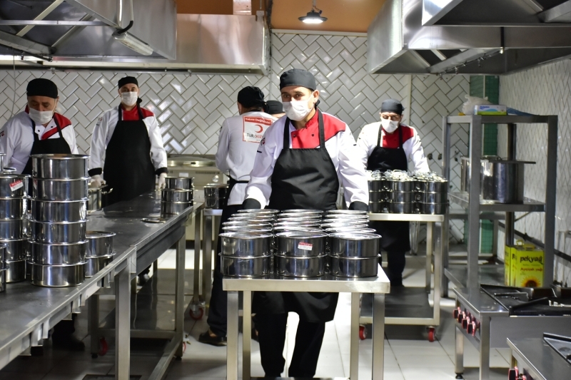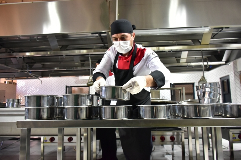 Sabahın erken saatlerinde aşevinde çalışmalara başlayan ekipler, hijyen kurallarına uyarak özenle hazırladıkları 3 çeşit yemeği sefer taslarına koyarak yeni tip koronavirüs (Kovid-19) tedbirleri kapsamında evlerinden çıkamayan yaşlı ve hastalar öncelikli olarak ihtiyaç sahiplerinin evlerine götürüyor.