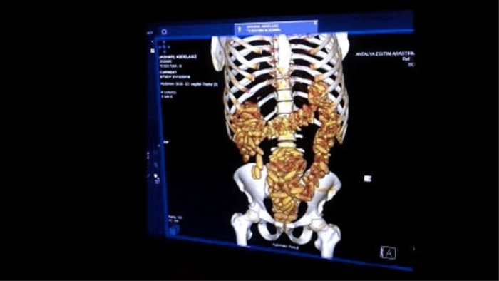 '3 KİLO UYUŞTURUCU ÇIKARDILAR' Hastanede yapılan tespit sonrasında şahıslar vücut boşluklarında, midelerinde ve bağırsaklarında her biri ortalama 10 gram ağırlığında olmak üzere kapsül halindeki marok esrar (Fas esrarı) olduğu değerlendirilen uyuşturucu maddeleri doğal yollardan çıkarmaya başladı.