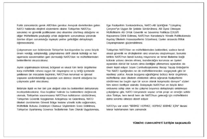 Dörtlü Zirve’de liderlere İletişim Başkanlığınca İngilizce, Almanca ve Fransızca olarak hazırlanan “Stratejik İttifakın Güçlü Üyesi Türkiye” kitabını takdim etti. İşte o kitap...