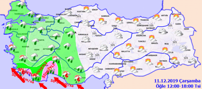 Meteoroloji Genel Müdürlüğü tarafından yapılan son değerlendirmelere göre: Marmara, Ege, Batı ve Orta Akdeniz, İç Anadolu’nun güney ve batısı ile Yozgat, Kayseri, Nevşehir, Kırşehir, Kırıkkale, Düzce, Bolu ve Karabük çevrelerinin sağanak ve yer yer gök gürültülü sağanak yağışlı geçeceği tahmin ediliyor. Yağışların; Muğla, Isparta ve Burdur çevrelerinde kuvvetli (21-50 kg/m2),Muğla ve Aydın’ın kıyı kesimleri, Isparta’nın güneyi, Burdur’un doğusu ile Antalya çevrelerinde şiddetli (51-100 kg/m2),Antalya il merkezi ve batı kıyılarında aşırı (100 kg/m2 üzeri) olması bekleniyor. Sabah ve gece saatlerinde iç ve doğu kesimlerde buzlanma ve don olayı ile birlikte yer yer pus ve sis hadisesi bekleniyor.