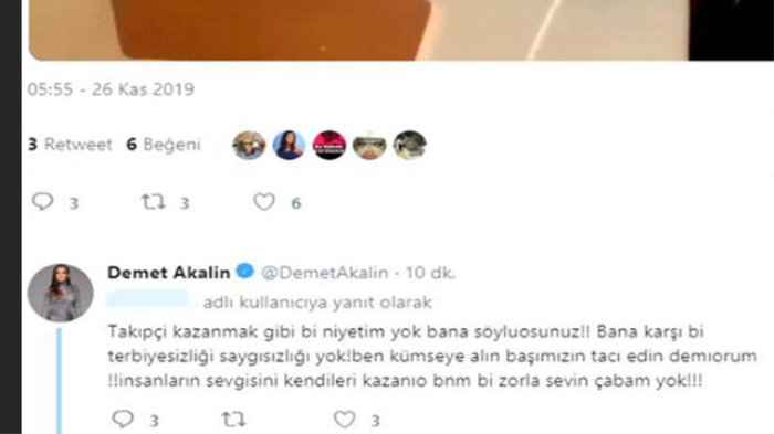 DEMET AKALIN ATEŞ PÜSKÜRDÜ "Özellikle size diyorum ünlü isimler. Takipçi kazanmak uğruna bunları gençlerin önüne koydunuz göklere çıkardınız" diyerek Ciğerci'nin videosunu paylaşan bir kullanıcıya Demet Akalın'dan tepki gecikmedi. Akalın, "Takipçi kazanmak gibi bir niyetim yok bana söylüyorsunuz! Bana karşı bir terbiyesizliği, saygısızlığı yok! Ben kimseye 'Alın başınızın tacı edin' demiyorum! İnsanların sevgisini kendileri kazanıyor. Benim 'zorla sevin' çabam yok!" dedi.