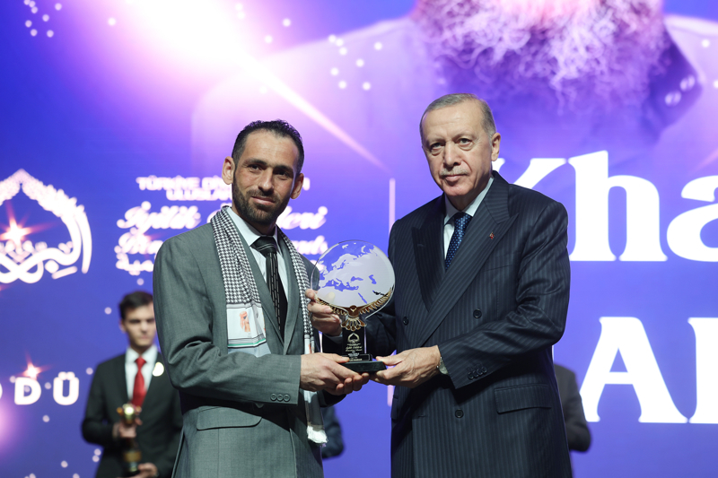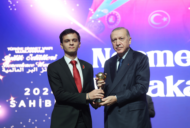 Cumhurbaşkanı Erdoğan, yurt içi iyilik ödülüne layık görülen İstanbul'da Aralık 2023'te düzenlenen Avrupa Wushu Kungfu Şampiyonası'nda şampiyon olduktan sonra podyumda Filistin bayrağı açarak dabke dansı yaptığı için şampiyonluğu iptal edilen Türk wushu kungfu sporcusu Necmettin Erbakan Akyüz'e ödülünü verdi.