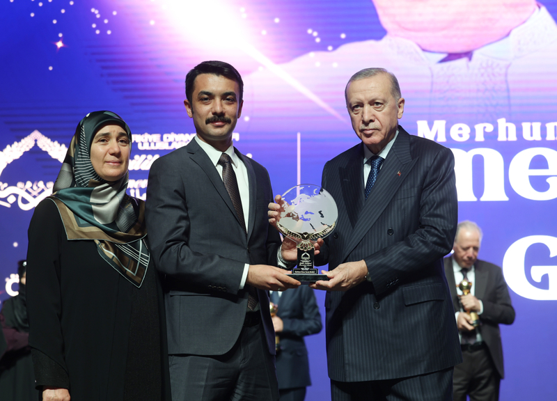Cumhurbaşkanı Erdoğan, Yurt İçi Vefa Ödülüne layık görülen, Kahramanmaraş merkezli 6 Şubat'ta yaşanan depremlerde hayatını kaybeden Hatay Müftüsü Ömer Faruk Bilgili'nin ödülünü eşi Zeliha Bilgili ve oğluna takdim etti.