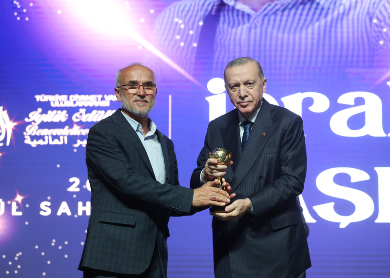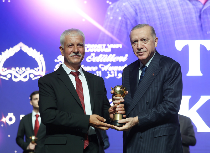 Cumhurbaşkanı Erdoğan, yurt içi iyilik ödülüne layık görülen farklı dillerde hazırladığı kartlar sayesinde, camisini ziyaret eden turistlerin sevgilerini kazan, İzmir'in Selçuk ilçesi İsa Bey Camii İmamı İbrahim Taşdemir'e ödülünü verdi.