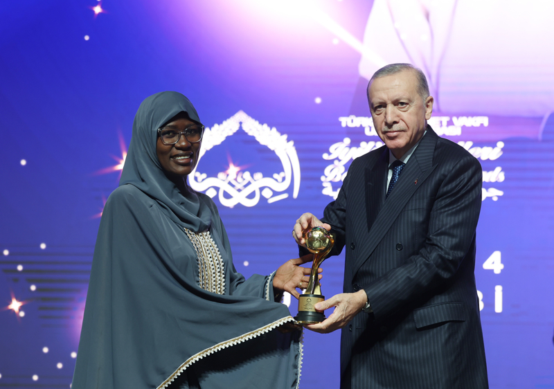 Cumhurbaşkanı Erdoğan, yurt dışı iyilik ödülüne layık görülen Buruni'de Türkiye'den gelen bağışlar sayesinde işitme engelliler için bir eğitim merkezi kuran Bisibo Amani'ye ödülünü verdi.