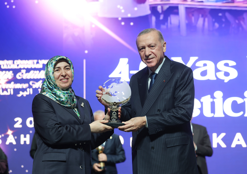 Cumhurbaşkanı Erdoğan, Yurt İçi Vefa Ödülüne layık görülen, Diyanet İşleri Başkanlığınca başlatılan 4-6 Yaş Kur'an Kurslarında Rize Sahil Camii öğreticilerinden Duygu Kaçaranoğlu'na ödülünü verdi.