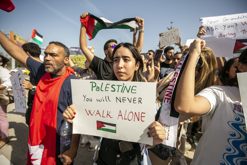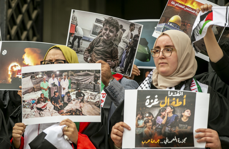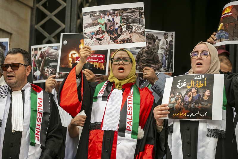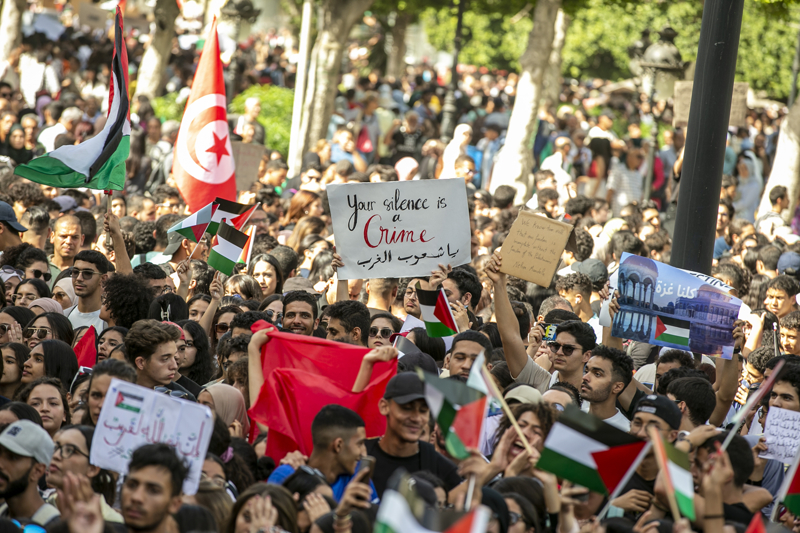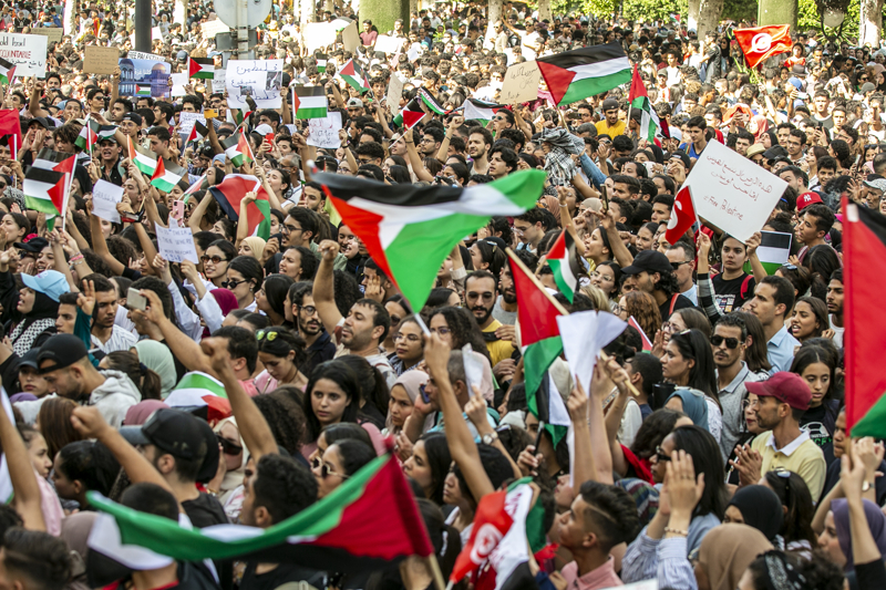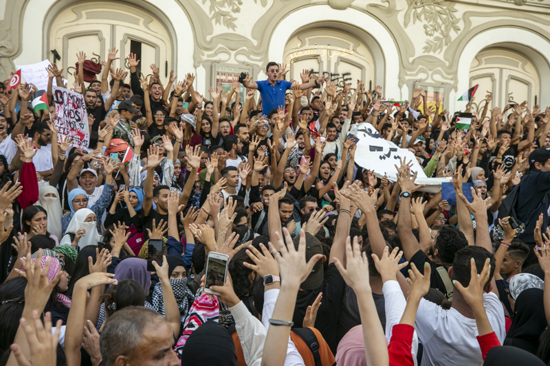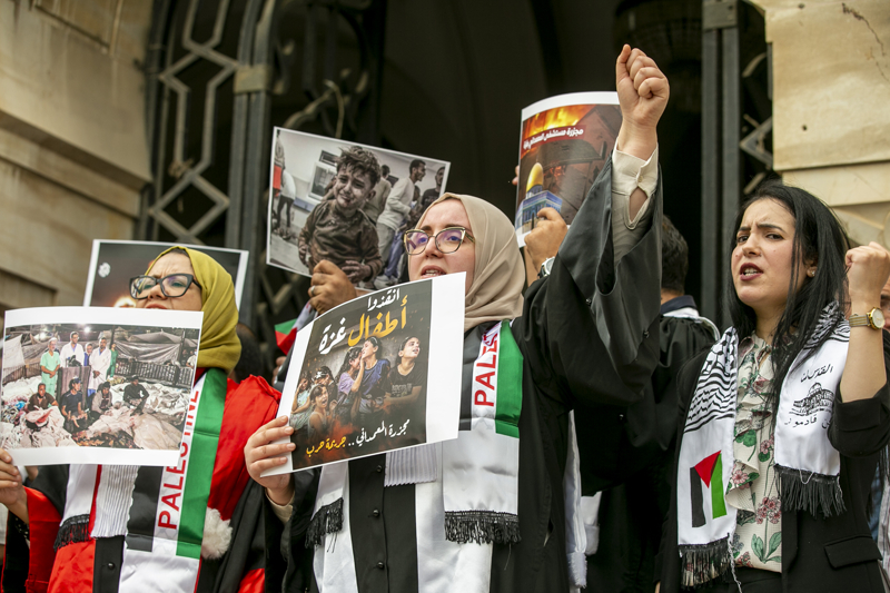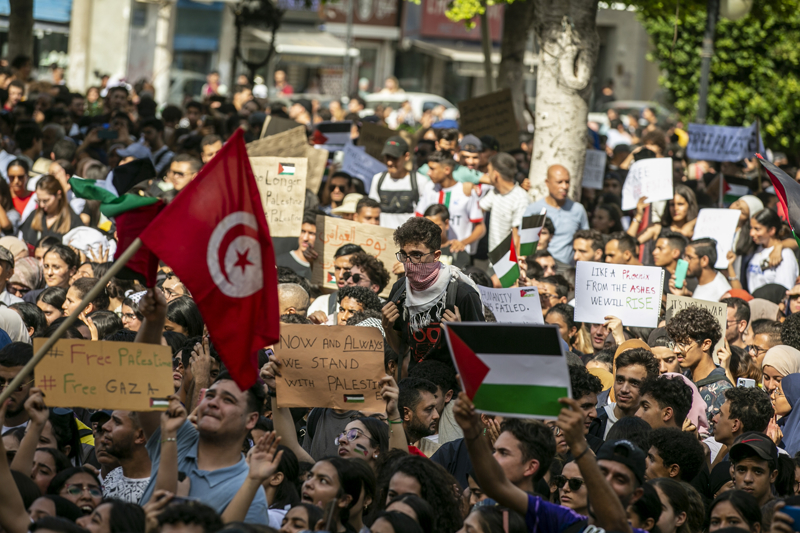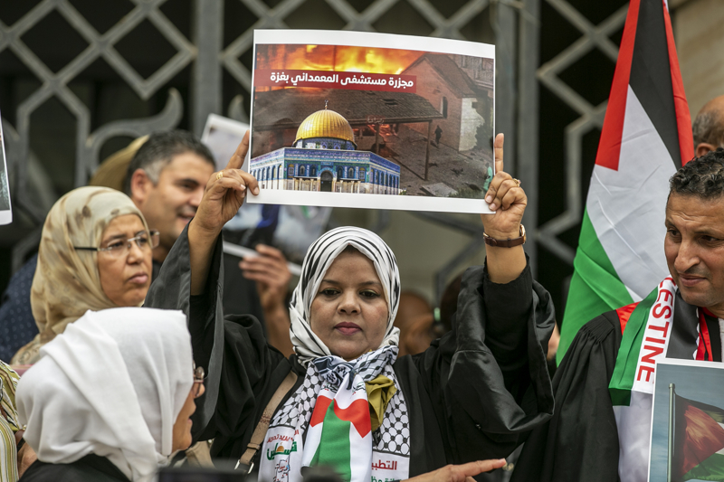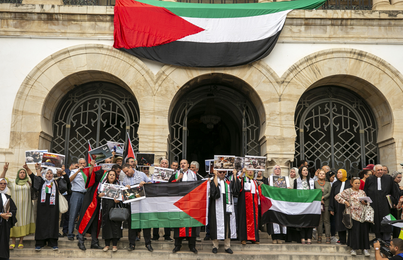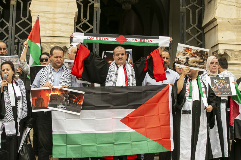 Tunuslu Hakimler Birliğinin çağrısı üzerine başkent Tunus'taki Adalet Sarayı önünde toplanan hakimler, Filistin bayrakları ve Filistin'e destek sloganlarının yazıldığı dövizler taşıdı.