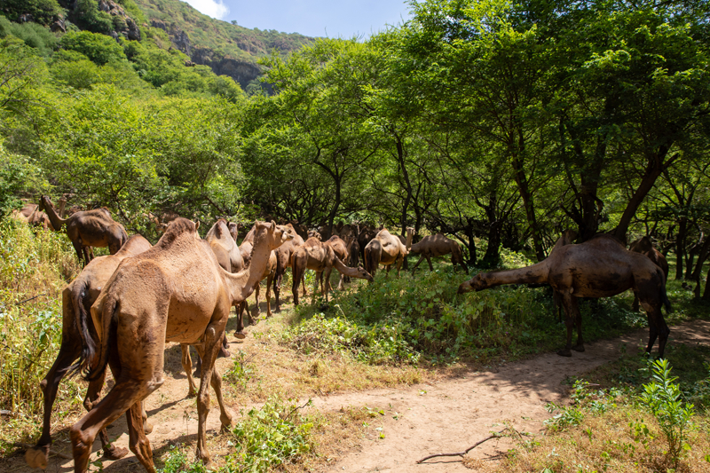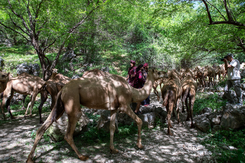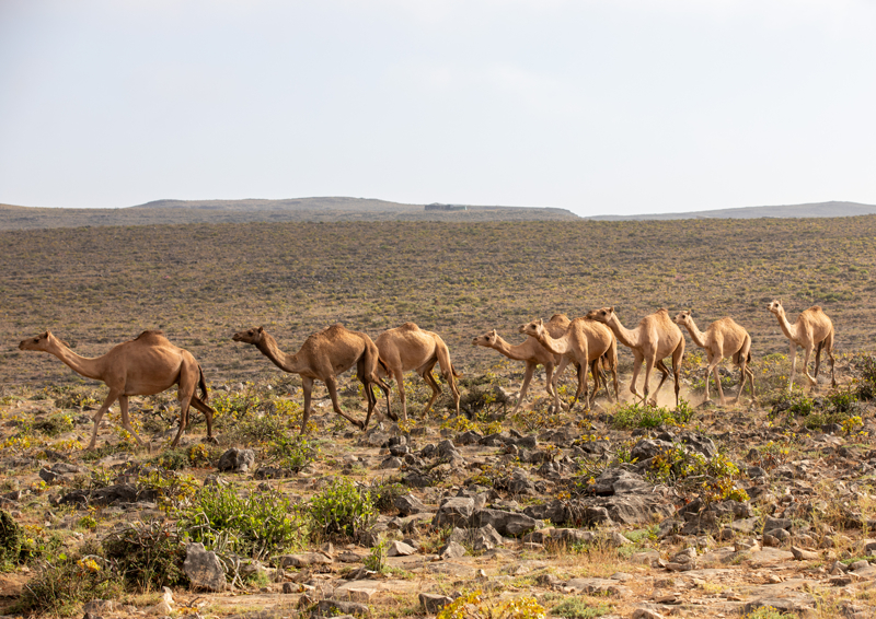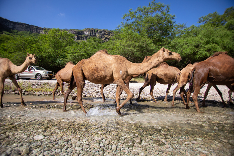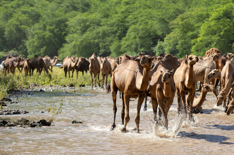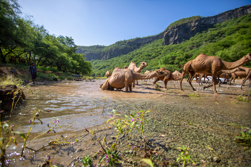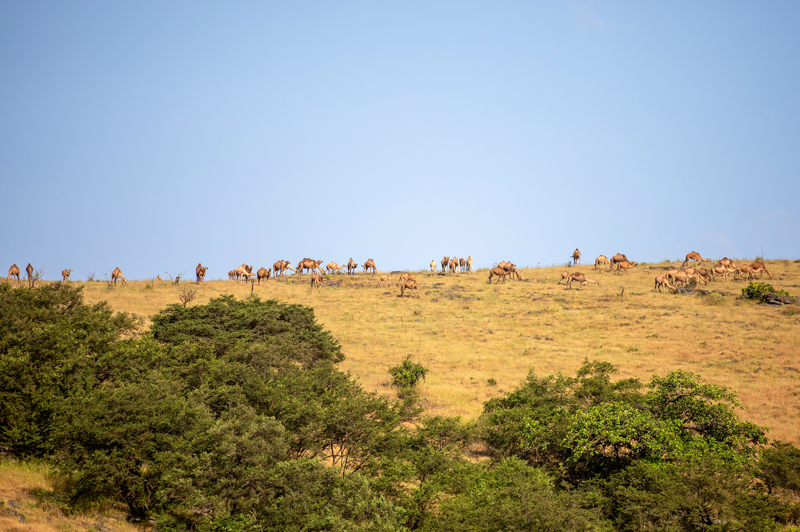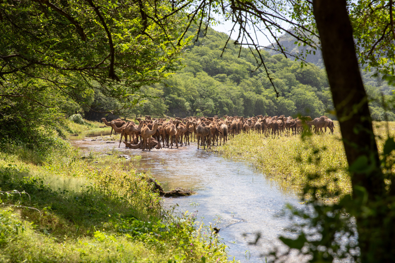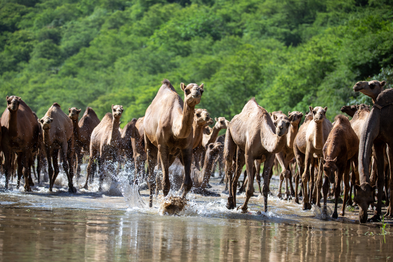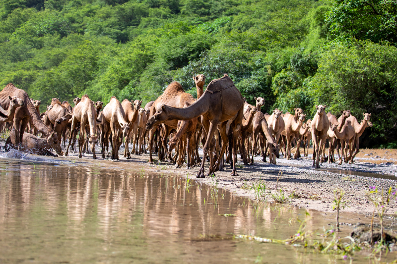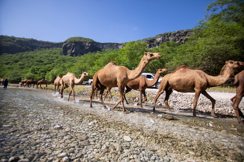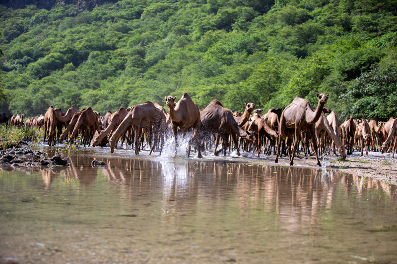 Umman'ın Zufar ilinde etkisini gösteren yağışların ardından besiciler, yetiştirdikleri develeri kentin otlak alanlarına götürmek için zorlu bir yolculuğa çıktı.